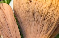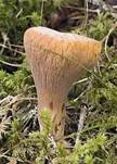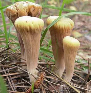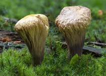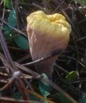 1-2 (3) cm Ø, 10-15 cm hoch, gelblich, ockergelblich, keulenförmig. Die Oberfläche ist längs-faltig, gerunzelt und zur Basis