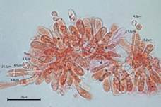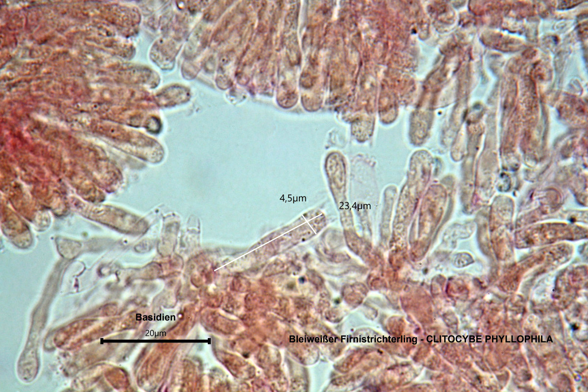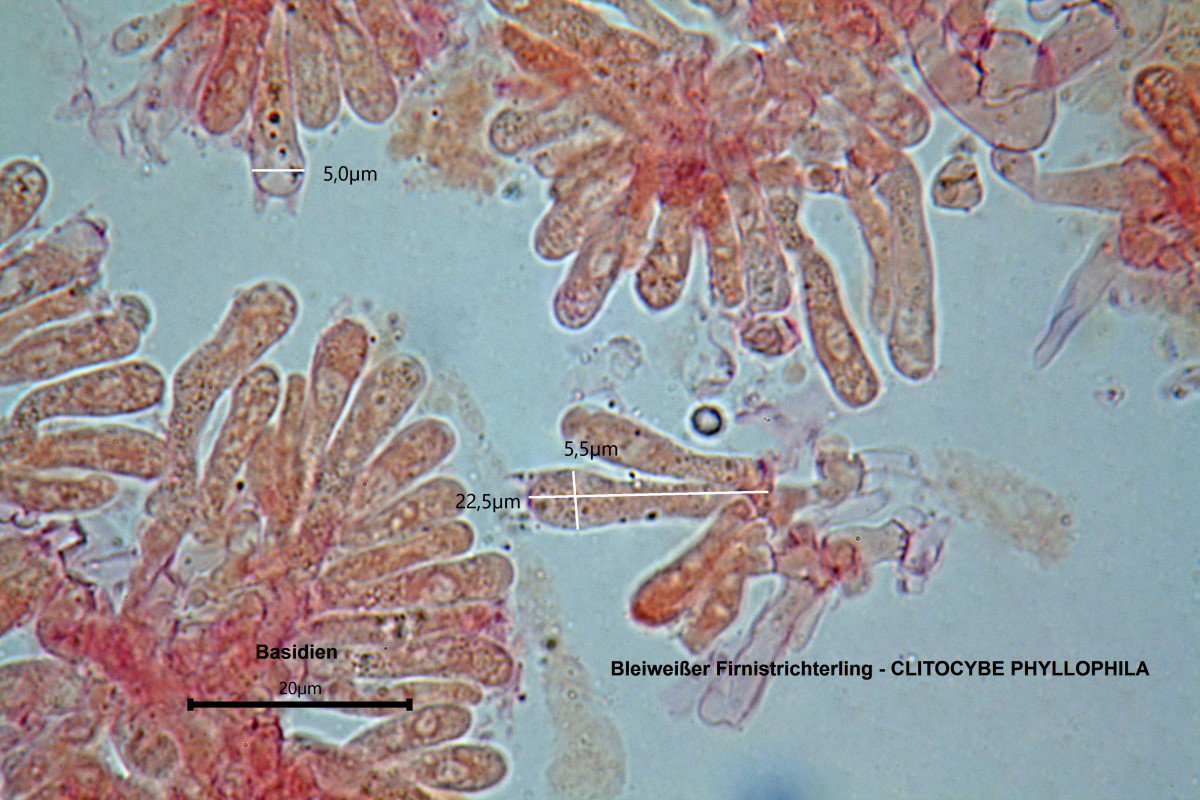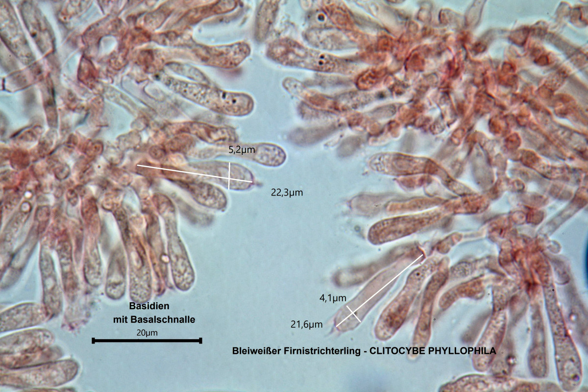 kollabiert, Q = 1,1-1,6. Basidien 18-25 x 4,5-6 µm, viersporig, keulig, mit