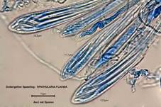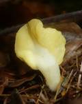 flach zusammengedrücktes, spatelförmiges gelbes Käppchen, Rand dunkler gelb. |