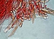 spindelförmig, Basis verjüngt, Myzel ist rötlichbraun. |