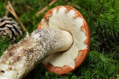 verfärbend, Huthaut überstehend. Birkenrotkappe = Stielschuppen schwarz bis schwarzbraun, Fleisch: Weiß, violett-grau, schwach blauend, Huthaut überstehend. Fuchsrotkappe = Stielschuppen