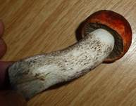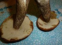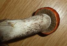 Am Stiel rosa bis braun verfärbend, Huthaut überstehend. Espenrotkappe = Stielschuppen orangebraun, Fleisch: Weiß, verfärbend graulila, Huthaut überstehend. Eichenrotkappe = Stielschuppen rötlich, rotbraun, Fleisch: Weiß, im Schnitt etwas rötlich,
