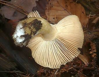 cremegelblich vorwiegend zur Stielbasis, ansonsten wie die Lamellen,