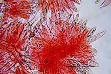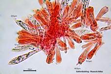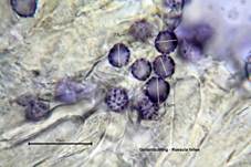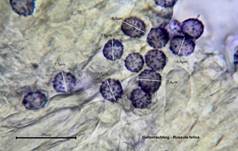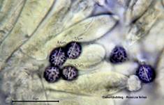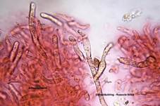 1-1,5 µm ist, feinnetzig verbunden. Basidien 30-55 x 8-11 µm, viersporig,