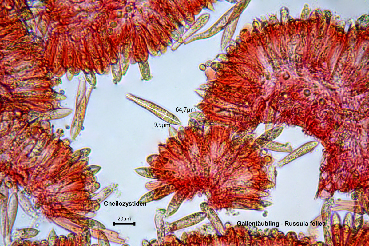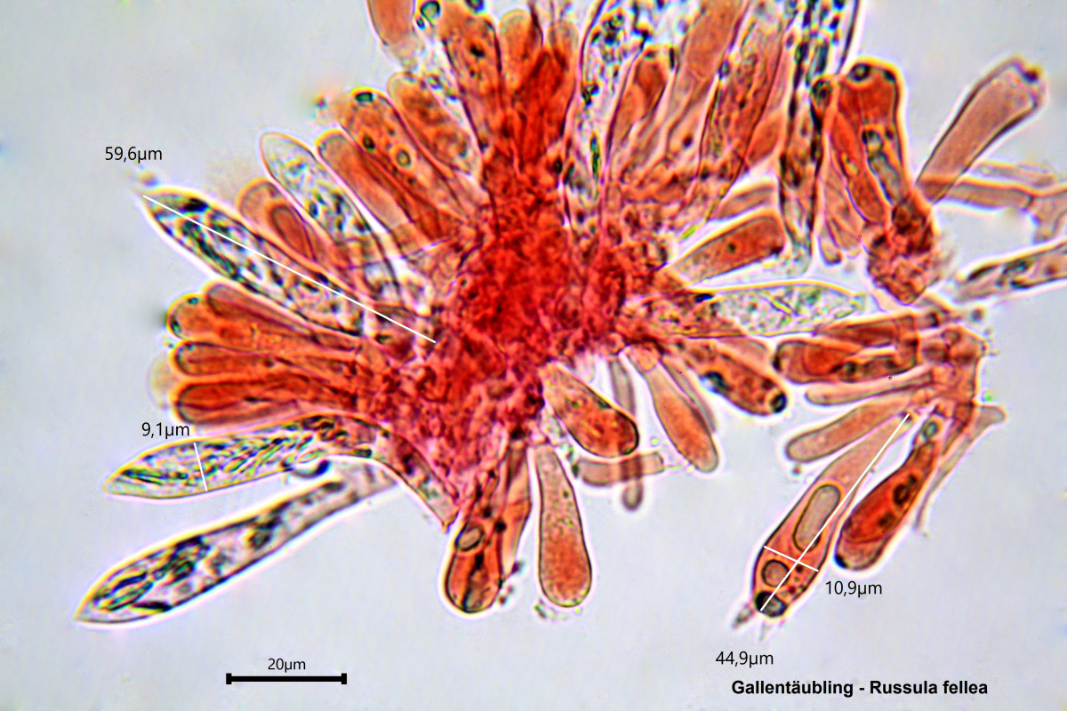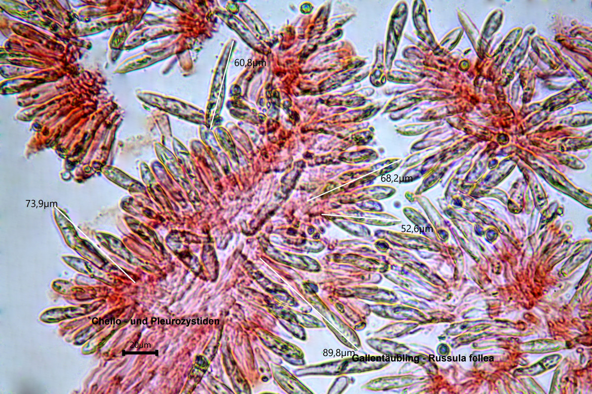 Pleurozystiden 50-115 x 6-11 µm. Cheilozystiden 30-70 x 5-9 µm,