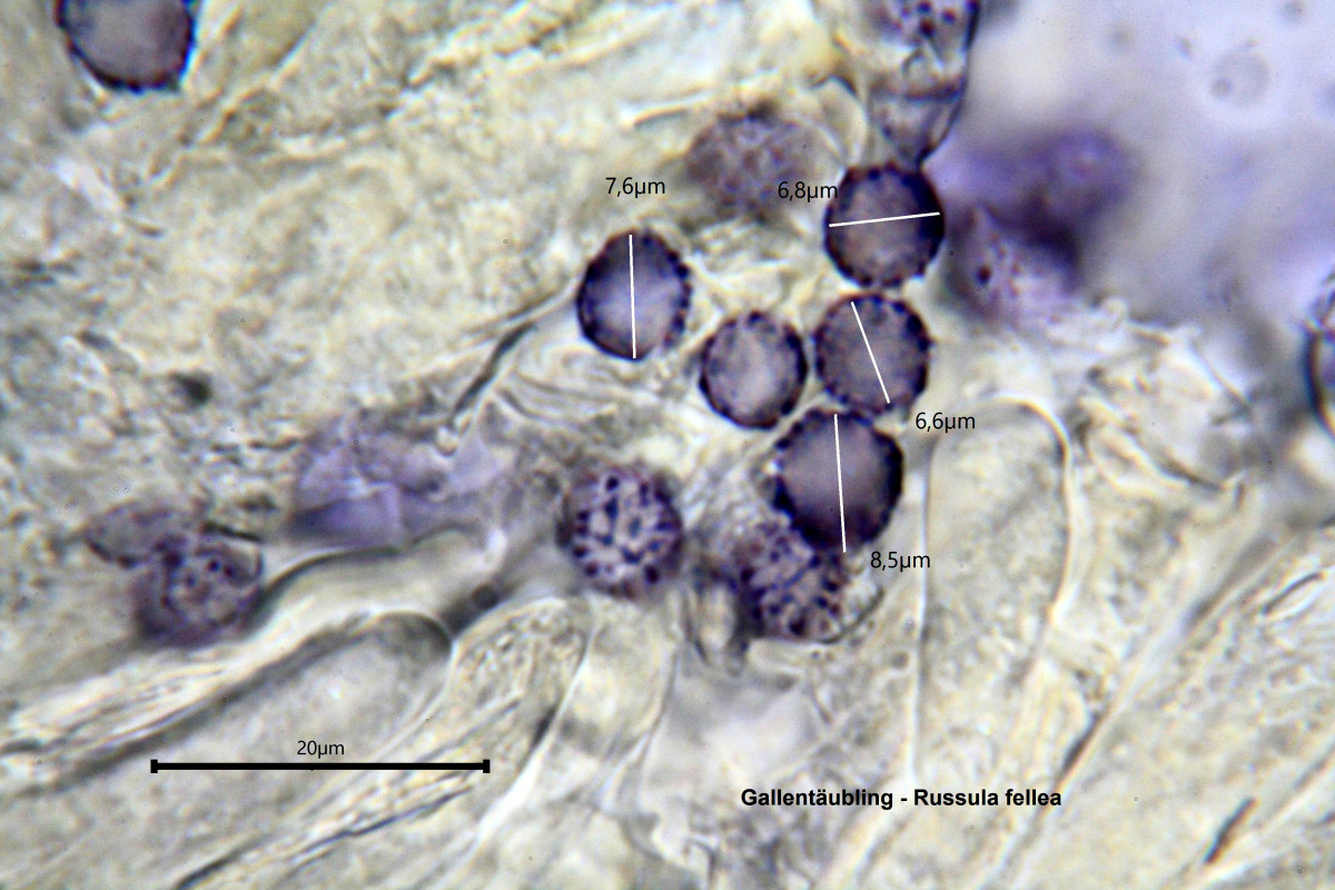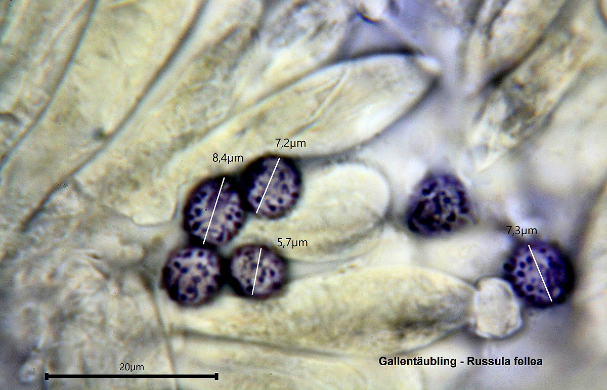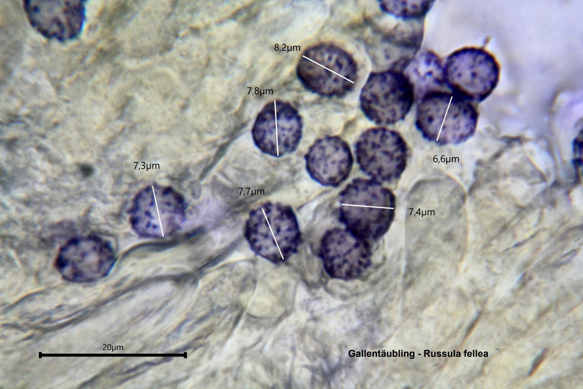 Hellgelblich, blass cremefarben (7,1-9,5 x 6,3-8,2 µm, elliptisch, mit