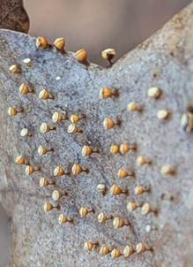 farblosen, dünnen Fäden, die zahlreiche große, weiße Kalkknoten verbinden.