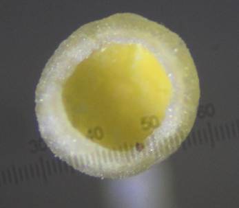 transparent (12-13 x 2,7-3 µm, länglich ellipsoid, fast zylindrisch, mit