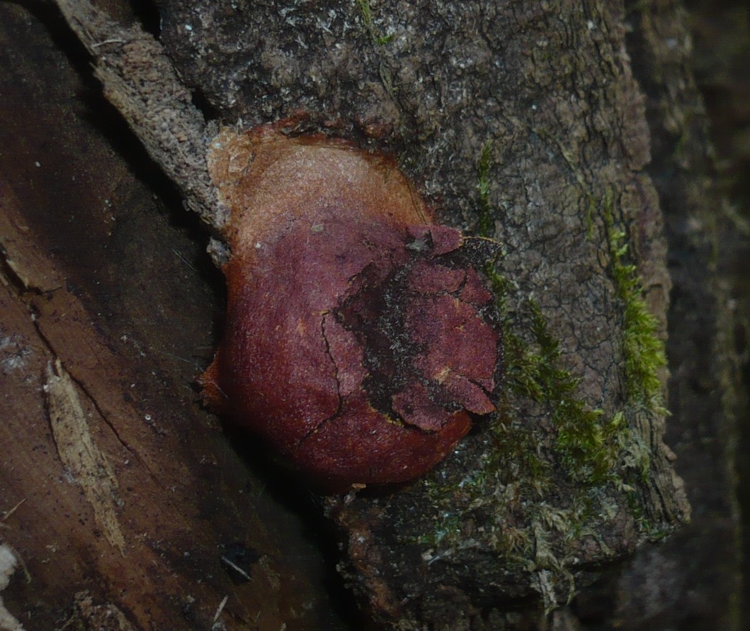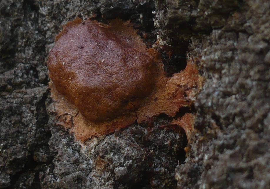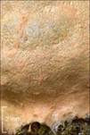 schaumartig, schleimig glänzend, Enden können etwas striegelig-weiß-rötlich werden, oft flacher Belag, der aderige Strukturen ausbildet. Plasmodium hellrosa, Cortex (Rinde) dünn rosa,