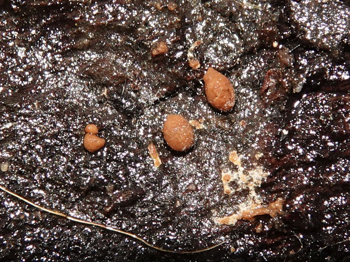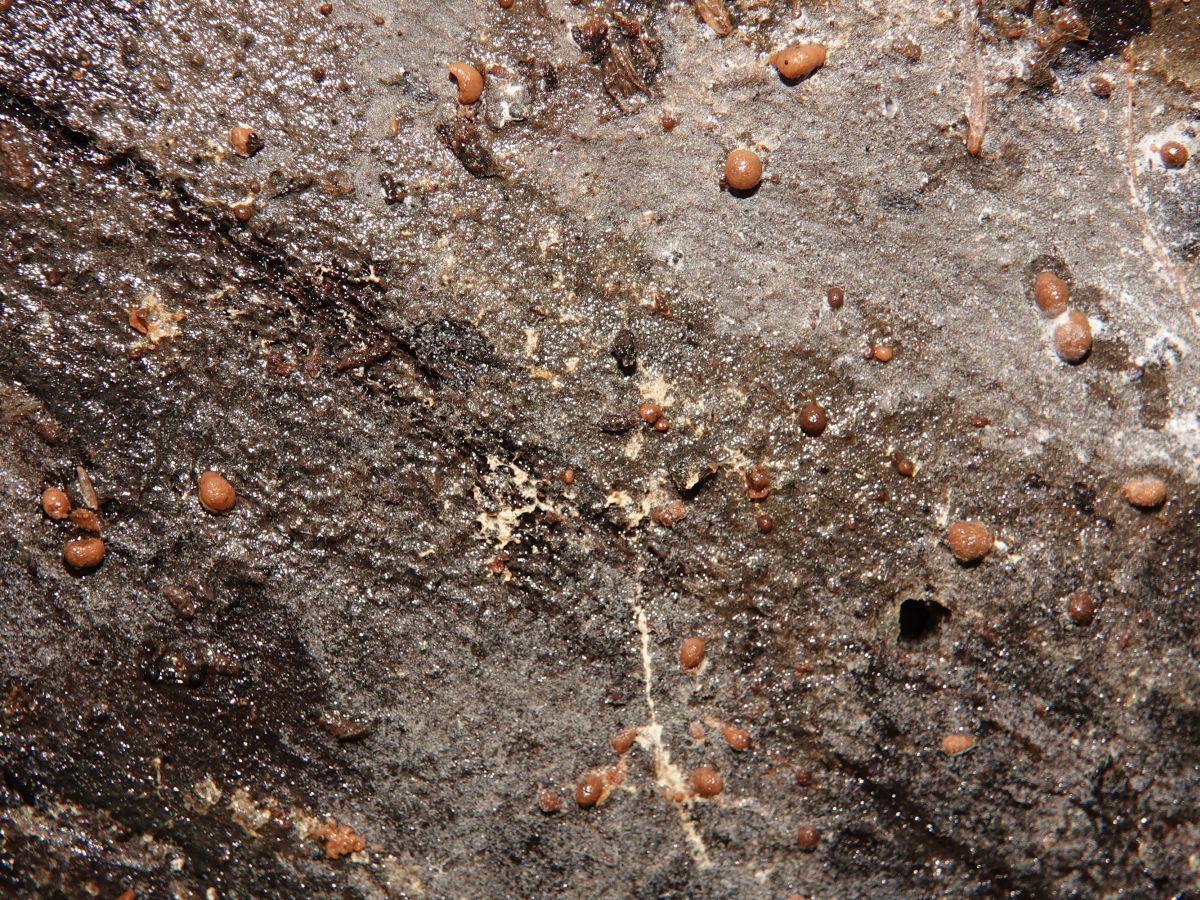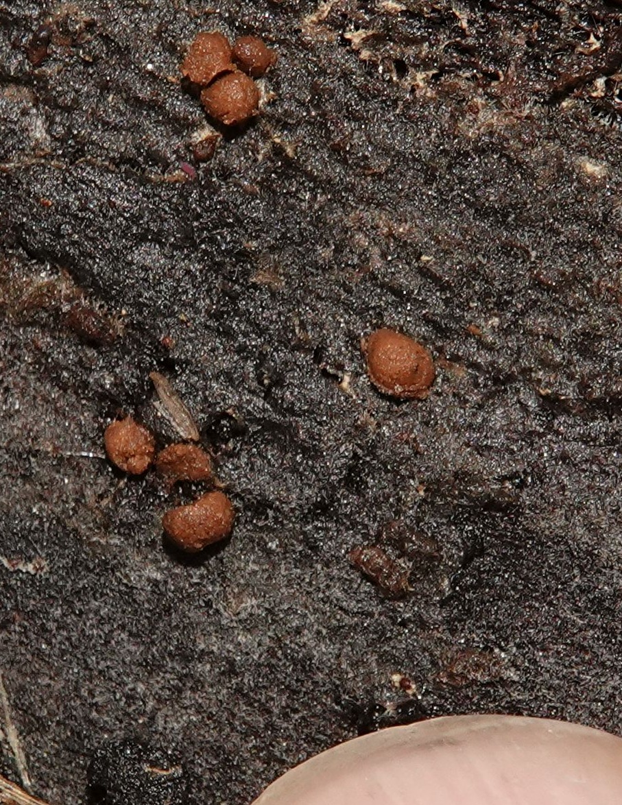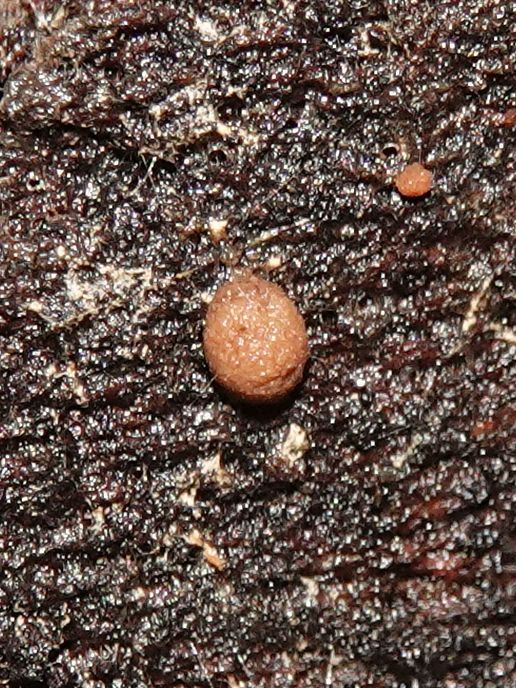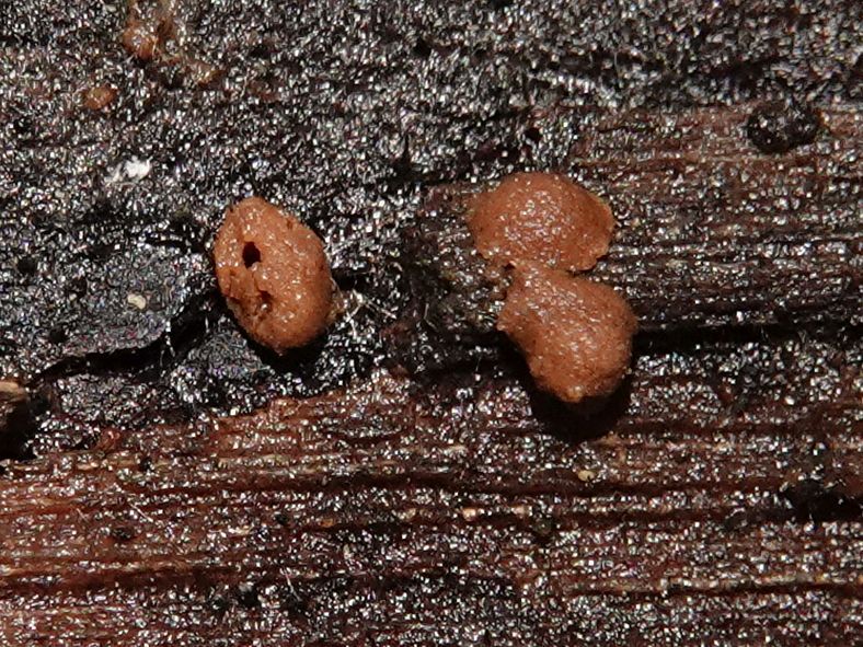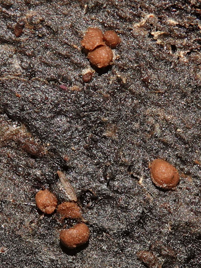 fleischbräunlich, Perithecien und Öffnungen sind dicht gedrängt (fast