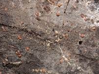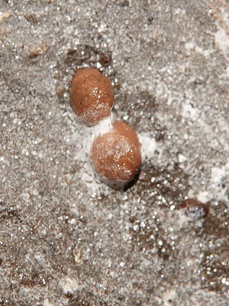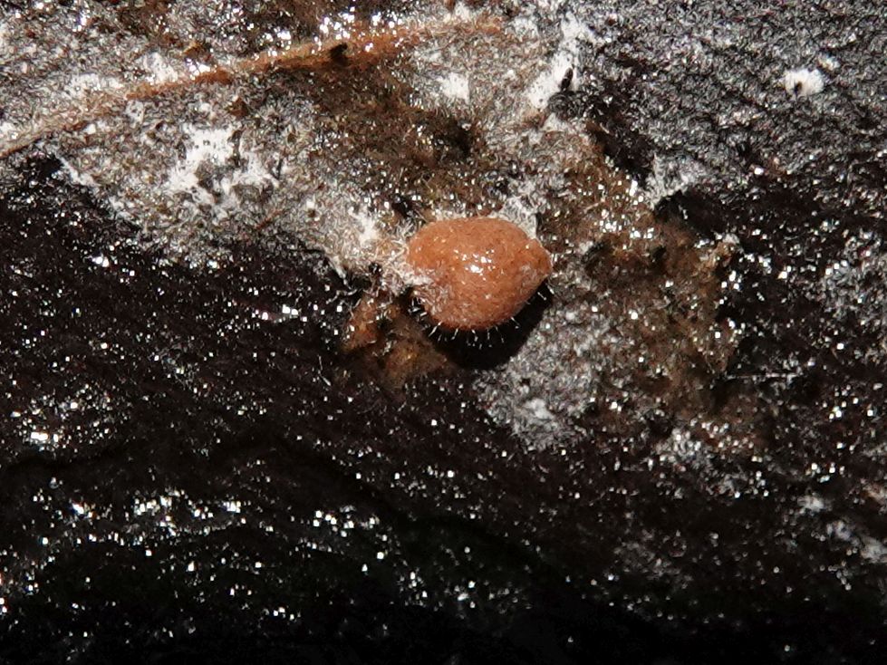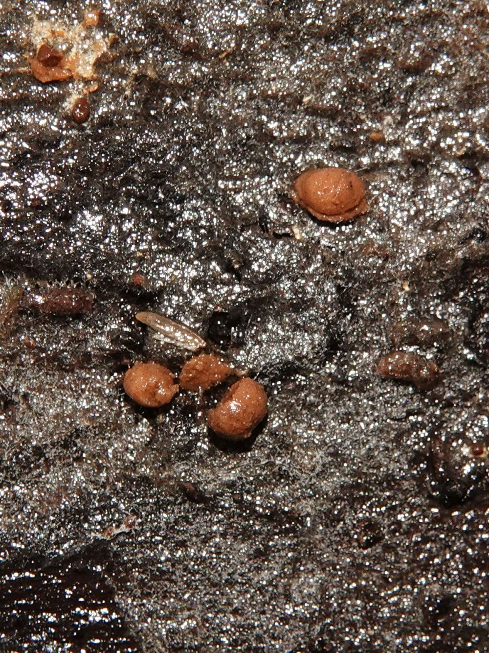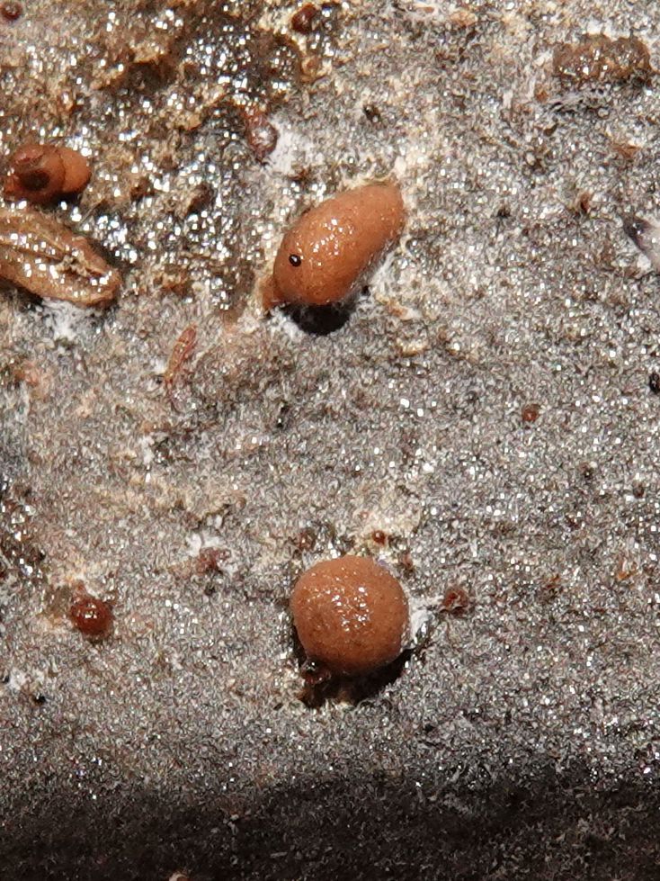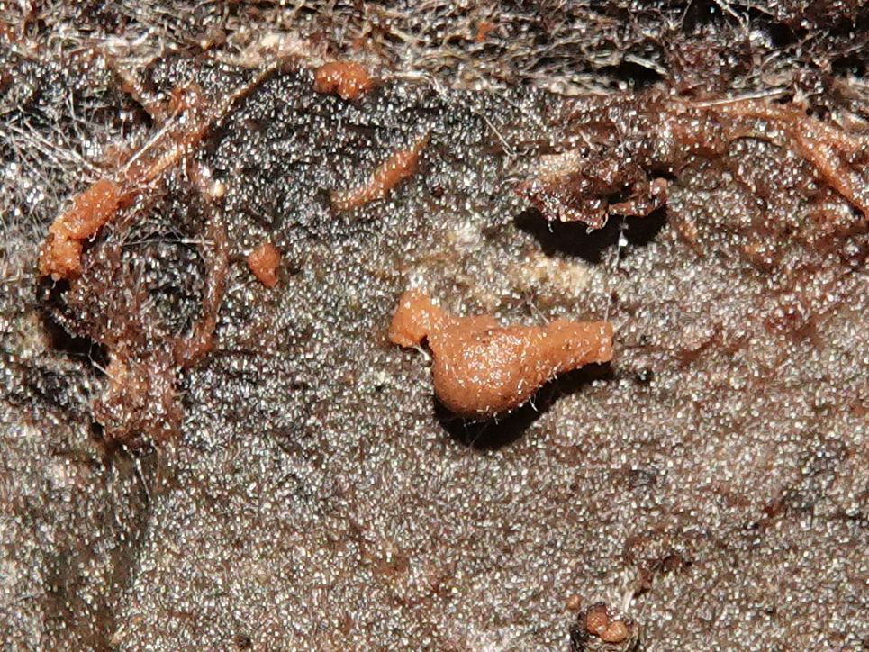 fleischbräunlich, Perithecien und Öffnungen sind dicht gedrängt (fast