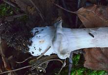 verdickt, niemals knollig, Volva weißlich. Spitze ist leicht vom Hutfleisch