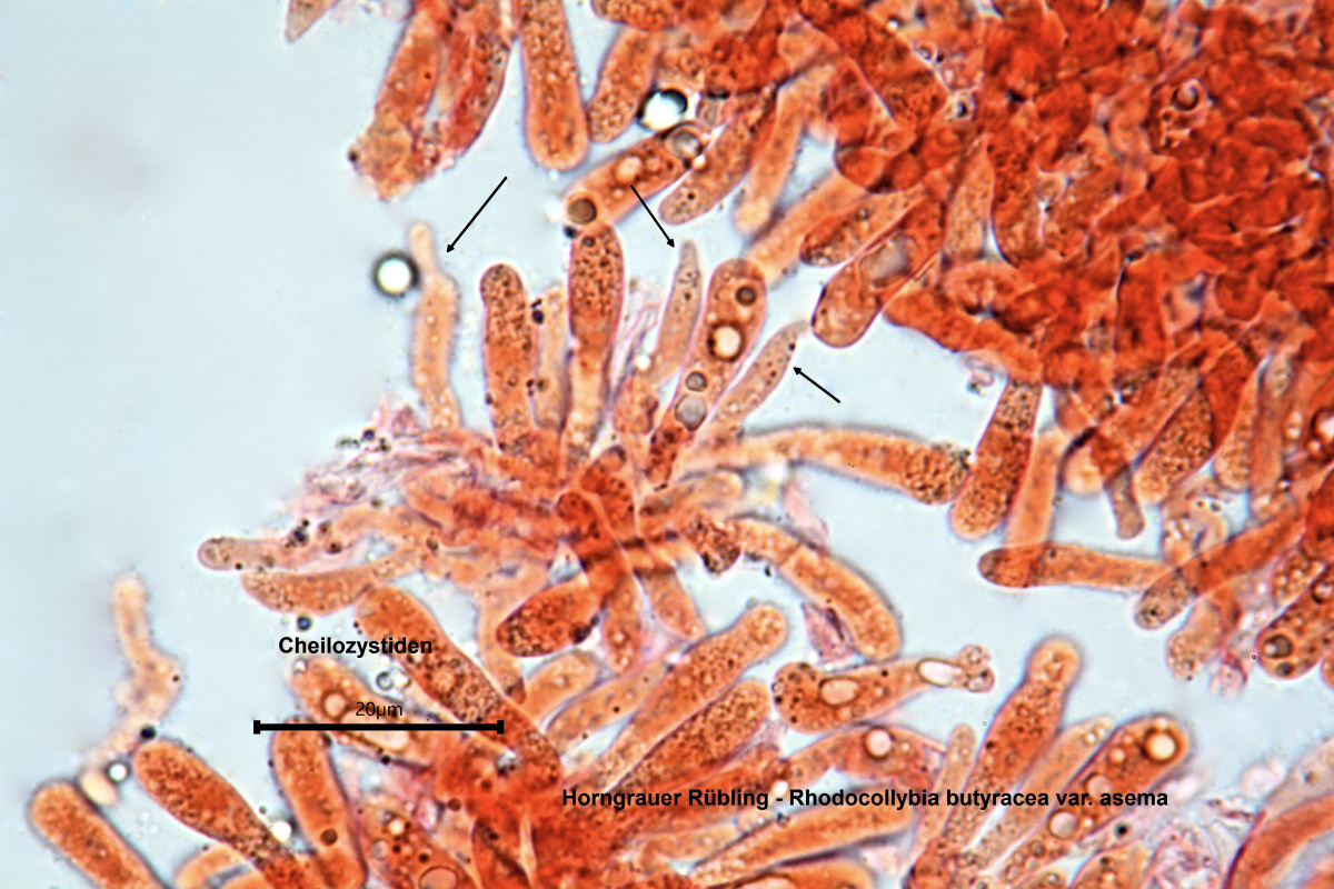 dünnwandig, erst spät dextrinoid. Cheilozystiden 15-35 x 3-10 µm,