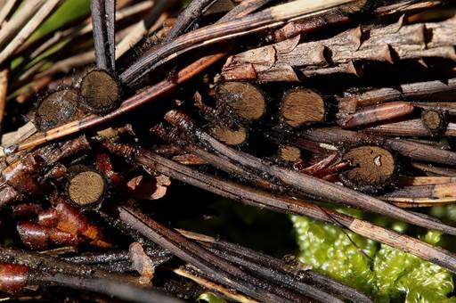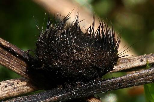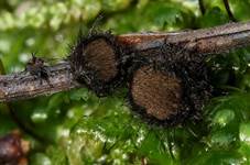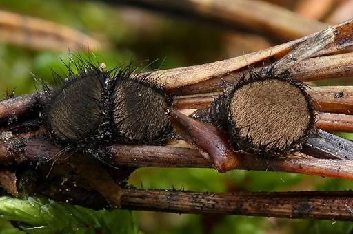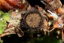 1-3 (4) mm Ø, dunkelbraun, becherförmig, rundlich oder schüsselförmig, Außenseite schwarzbraun bis schwarz beharrt. Die Haare sind dickwandig und septiert mit einer Länge > 200 µm. |