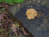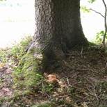 Am Boden weißlich entspringender am Wurzelgeflecht eines Baumes