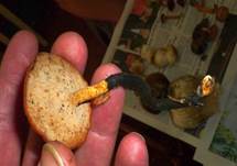 1-3 (4) cm lang, 2-7 (9) mm Ø dick, bräunlich, gelbbraun. Basis