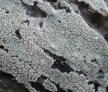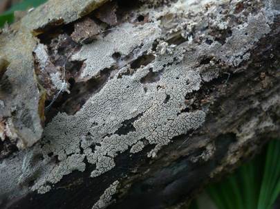 fein weißlich inkrustiert. Die Basis ist angedrückten Hyphen belegt. |
