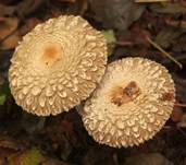 Schüppchen besetzt auf beigen bis mittelbraunem Grund. Hutmitte schokoladenbraun, Rand flockig, Habitus erst