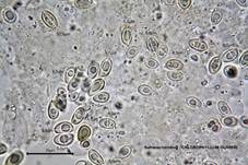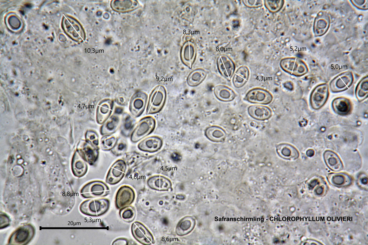 Weiß (8-12 x 6-8 µm, elliptisch mit Keimporus). |