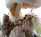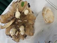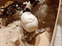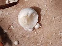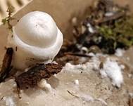 4-7 (10) cm lang, 1-2 (3) cm Ø dick, weißlich bis hellgrau mit häutiger