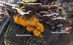Zitterling und Gelber Schichtpilz-Zitterling (auf Laubholz), Zungenhörnling, Zerfließende Gallertträne,