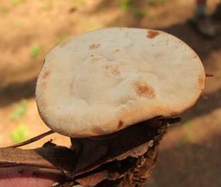 uneben. Die Mitte ist bräunlich, zum Rand hin weißlich oder zumindest heller. |