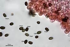 Dunkelbraun, schwärzlich-bräunlich (6-10,8 x 3-5,5 µm, oval, ellipsoid,