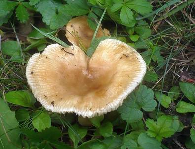 abgeflacht. Rand jung runzelig gewölbt, später gerieft, Haut bis zur Hälfte