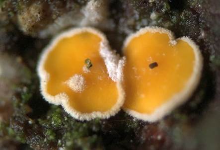 2-4 mm Ø. - LACHNELLULA FLAVOVIRENS (Orangegelbes Braunhaarbecherchen, Orangegelbes Braunhaarbecherchen). Sporen 7-10 x 4-6 µm,