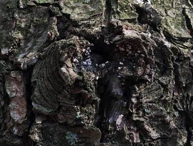 harzigen Oberfläche sitzend, Untergrund dadurch schwärzlich verfärbt,