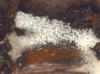 Sporenbüschel. Im Gegensatz zu ISARIA FARINOSA hat der Ungestielte Insektenschimmelpilz (BEAUVERIA BASSIANA) keinen Stiel.