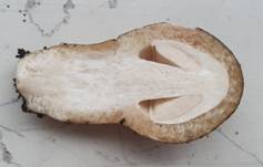 Basis verdickt, gelbbraun, braungelb geschuppt auf hellgelbem Grund, mit lappiger
